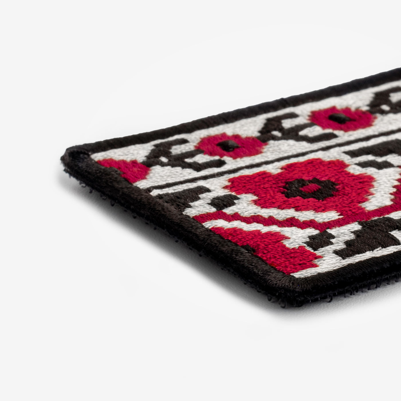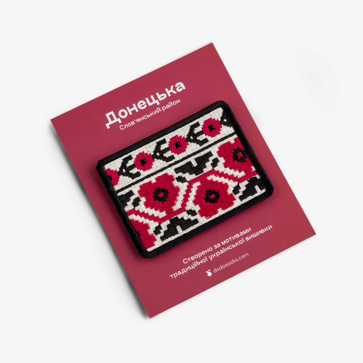 This Velcro patch draws inspiration from the traditional Ukrainian embroidery found in the Donetsk region’s Sloviansk district. It easily adheres to soft surfaces and adds a distinct touch to garments and accessories.