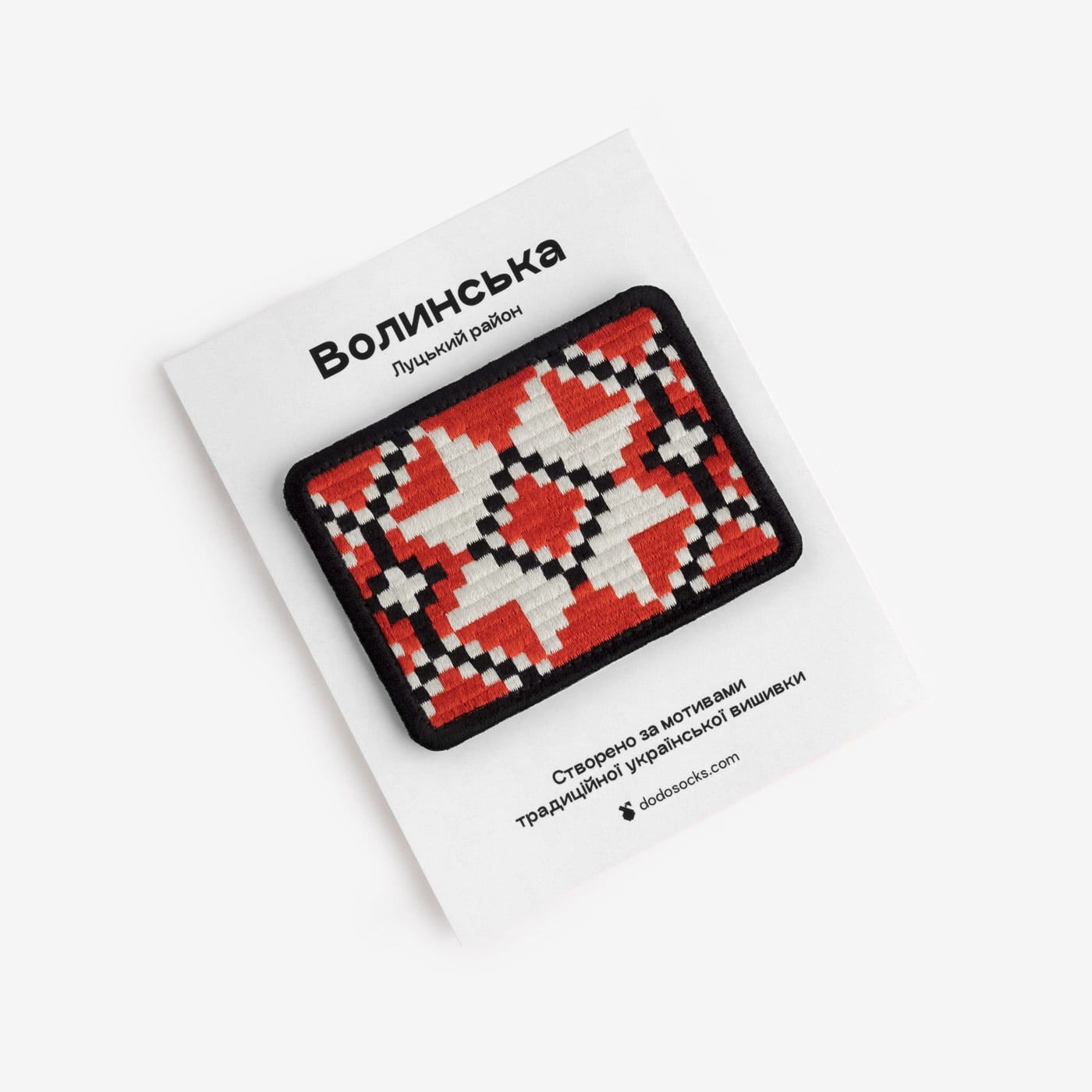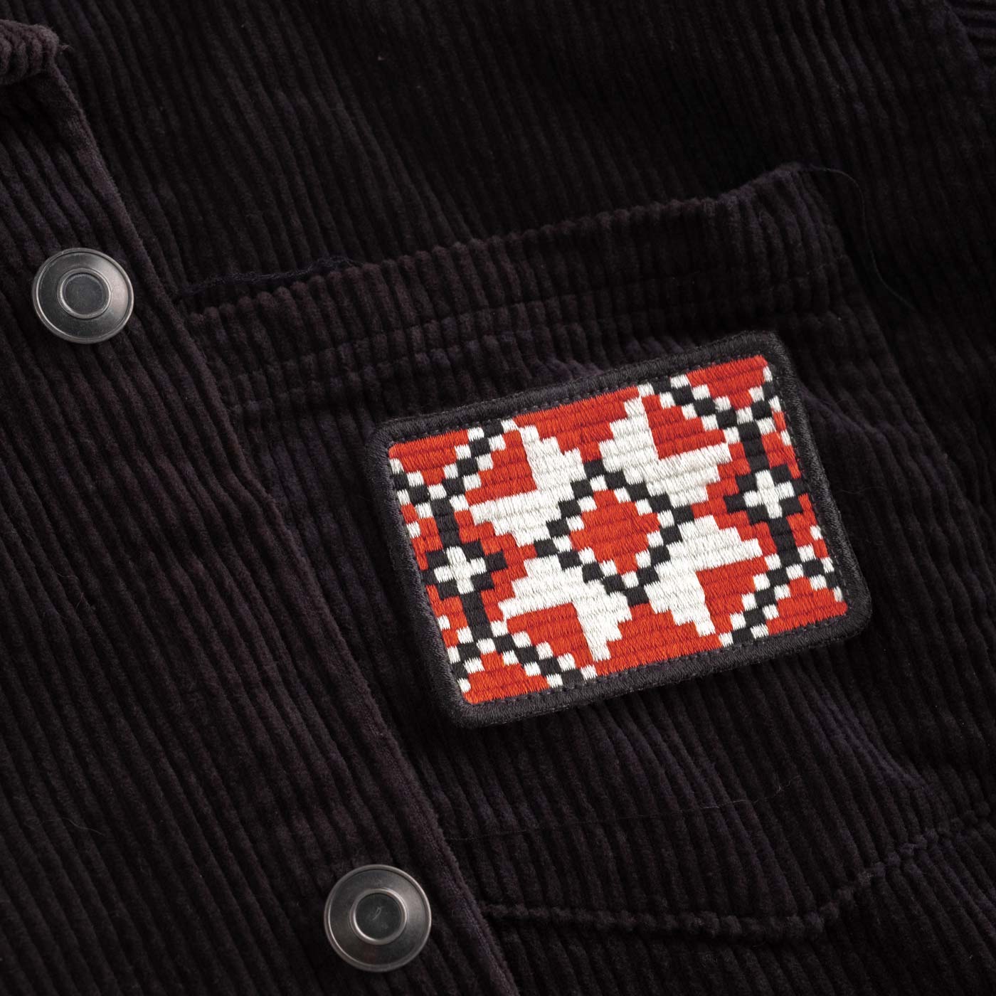 This Velcro patch draws inspiration from the traditional Ukrainian embroidery found in the Volyn region’s Lutsk district. It easily adheres to soft surfaces and adds a distinct touch to garments and accessories.
