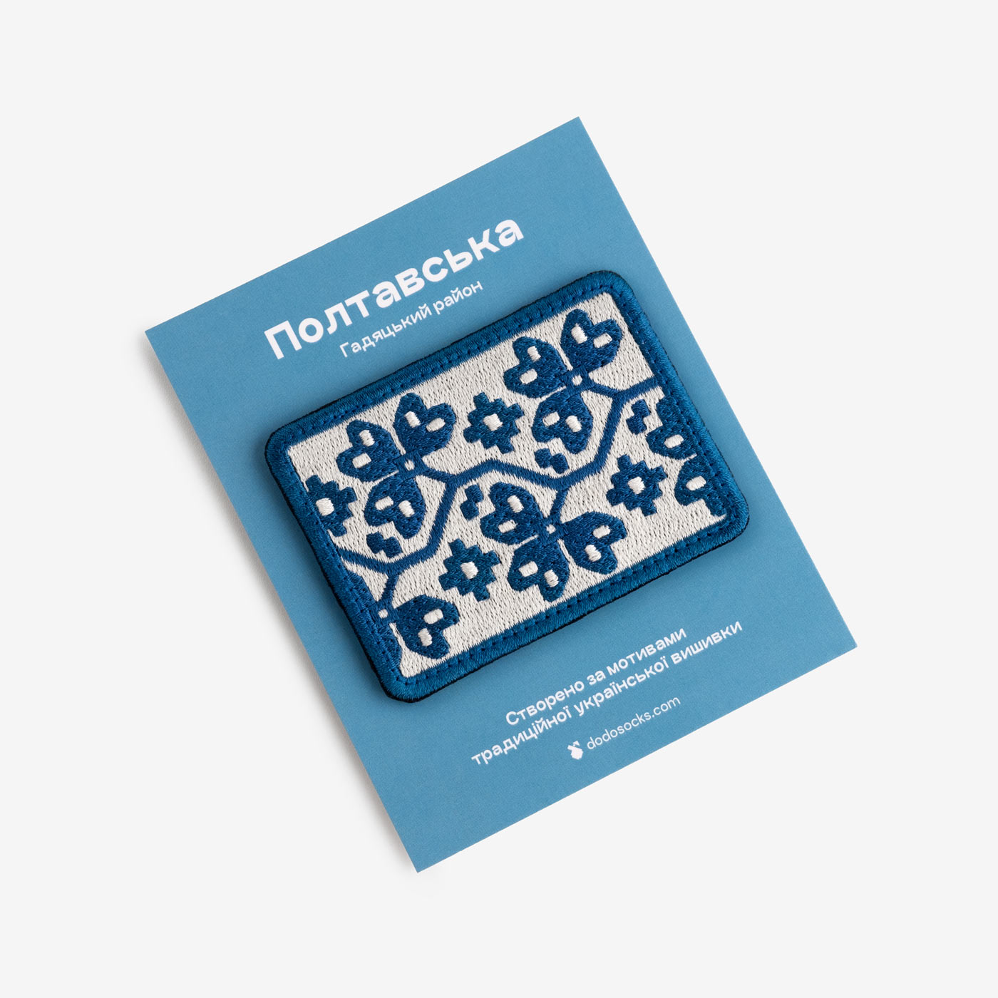 This Velcro patch draws inspiration from the traditional Ukrainian embroidery found in the Poltava region’s Hadiach district. It easily adheres to soft surfaces and adds a distinct touch to garments and accessories.