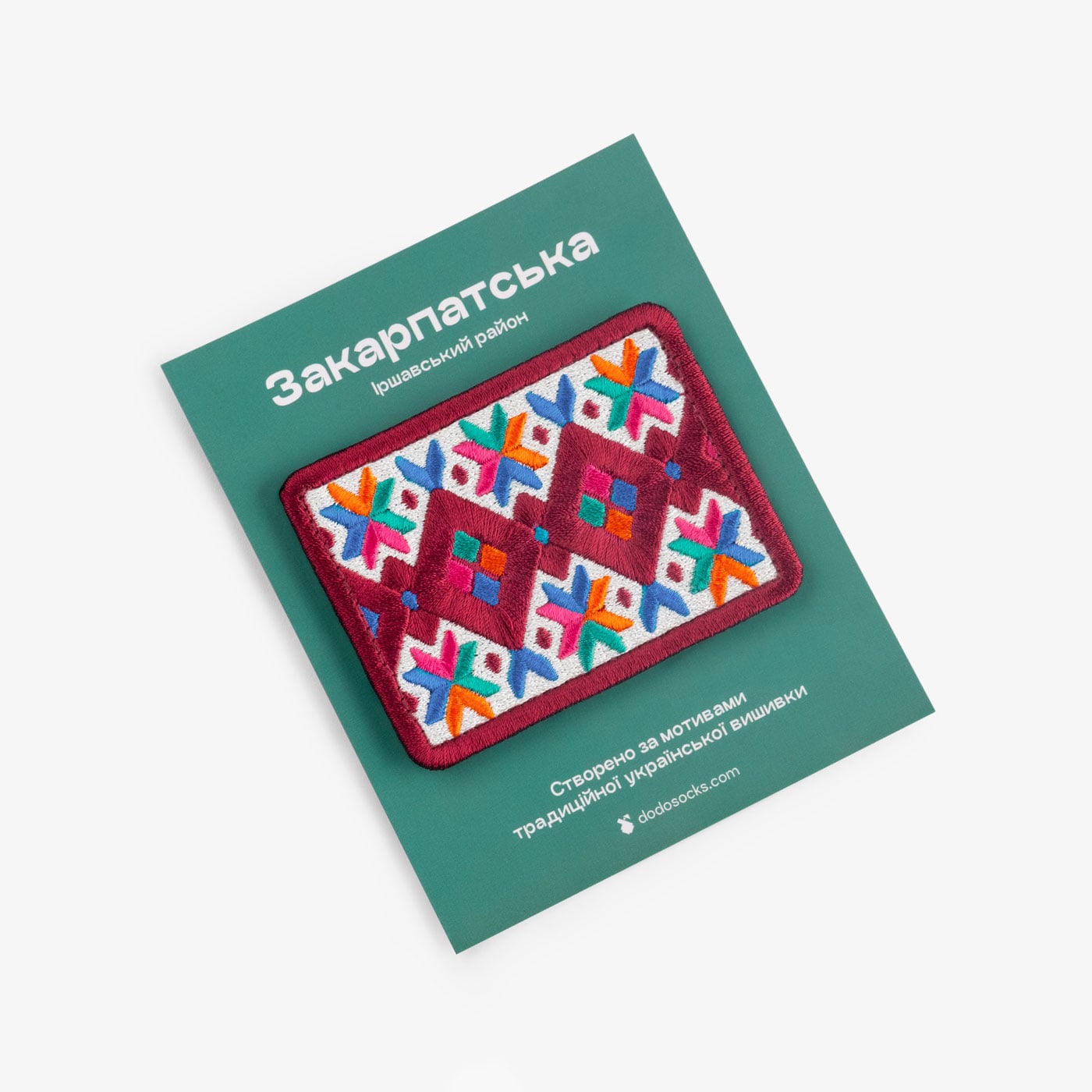 This Velcro patch draws inspiration from the traditional Ukrainian embroidery found in the Zakarpattia region’s Irshava district. It easily adheres to soft surfaces and adds a distinct touch to garments and accessories.