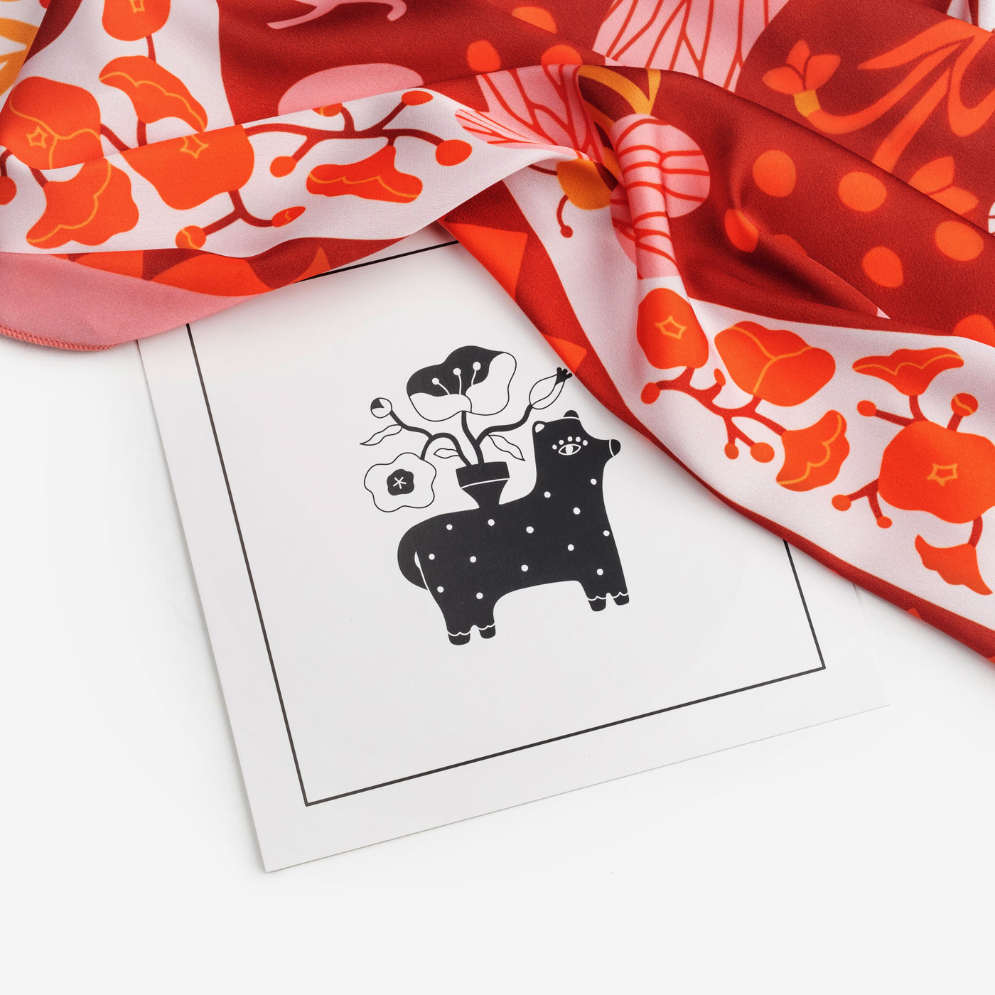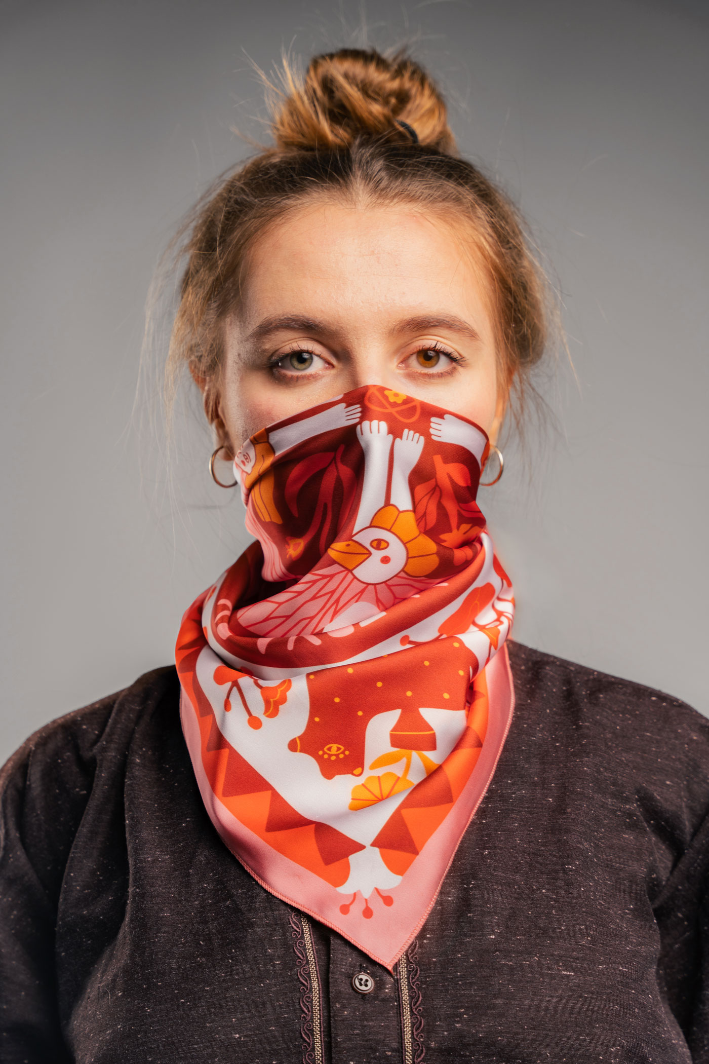 At the heart of the narrative lies the process of creation anew. What will the future creation be? Perhaps even its creators, the four divine beings, have yet to learn for sure. Their combined efforts transform a piece of clay into a magnificent work. Its variations are scattered across the corners of the scarf. However, regardless of the form the lump of earth takes, the crucial element lies in the love embedded within it. This soft and lightweight scarf will enrich any outfit and put that extra significance in your daily looks. Put it in your hair, on your neck, or use it as a coverup.