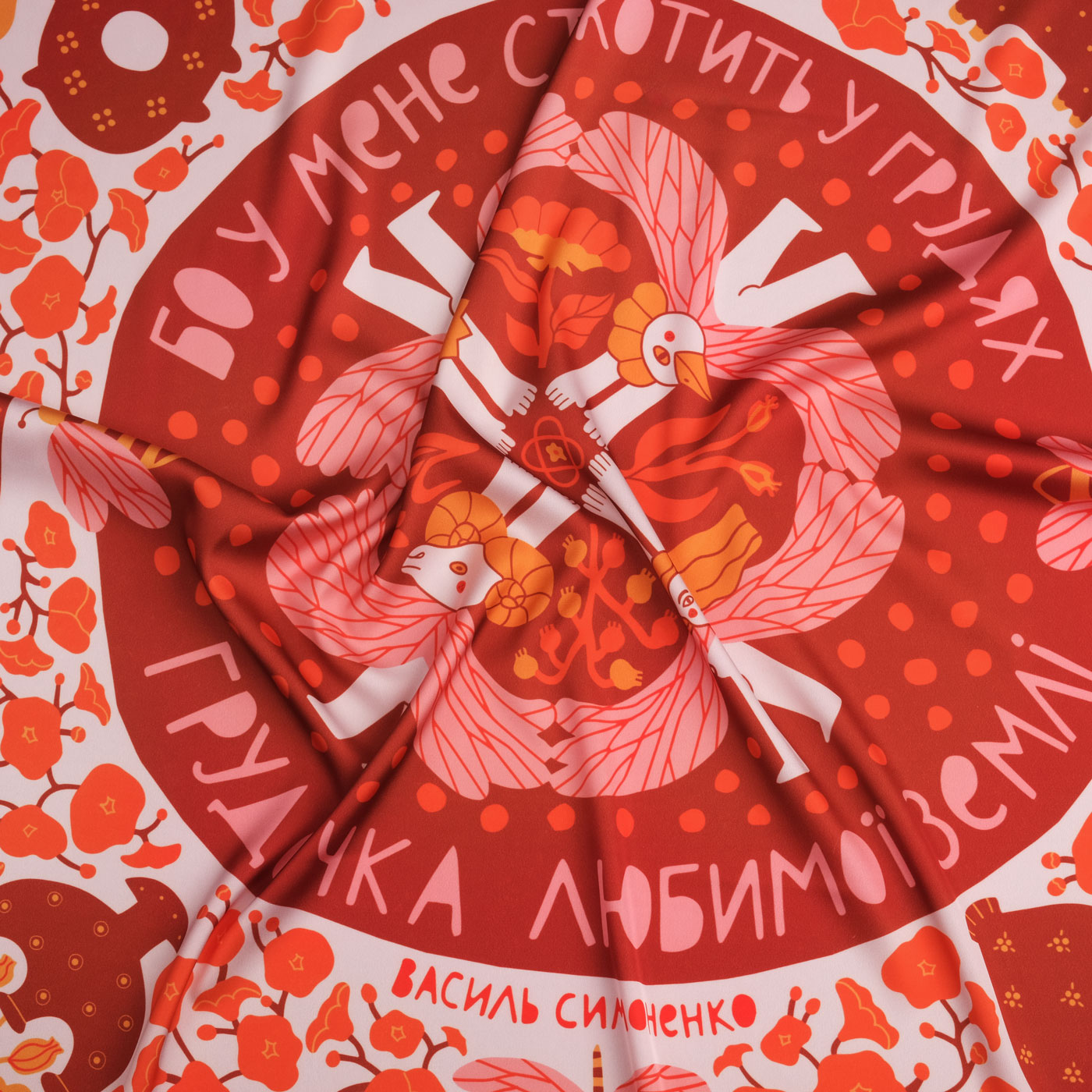 The scarf is a tribute to the profound longing for creation in all its forms. Its inspiration derives from the heartfelt poetry of Vasyl Symonenko’s “A Lump of Earth,” which brims with love for the homeland. Excerpts from the poem grace the scarf’s design, infusing it with poetic resonance.