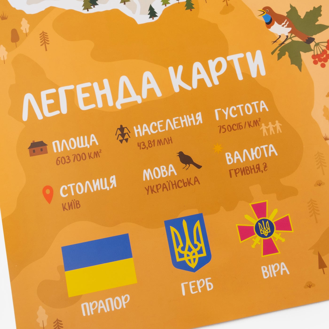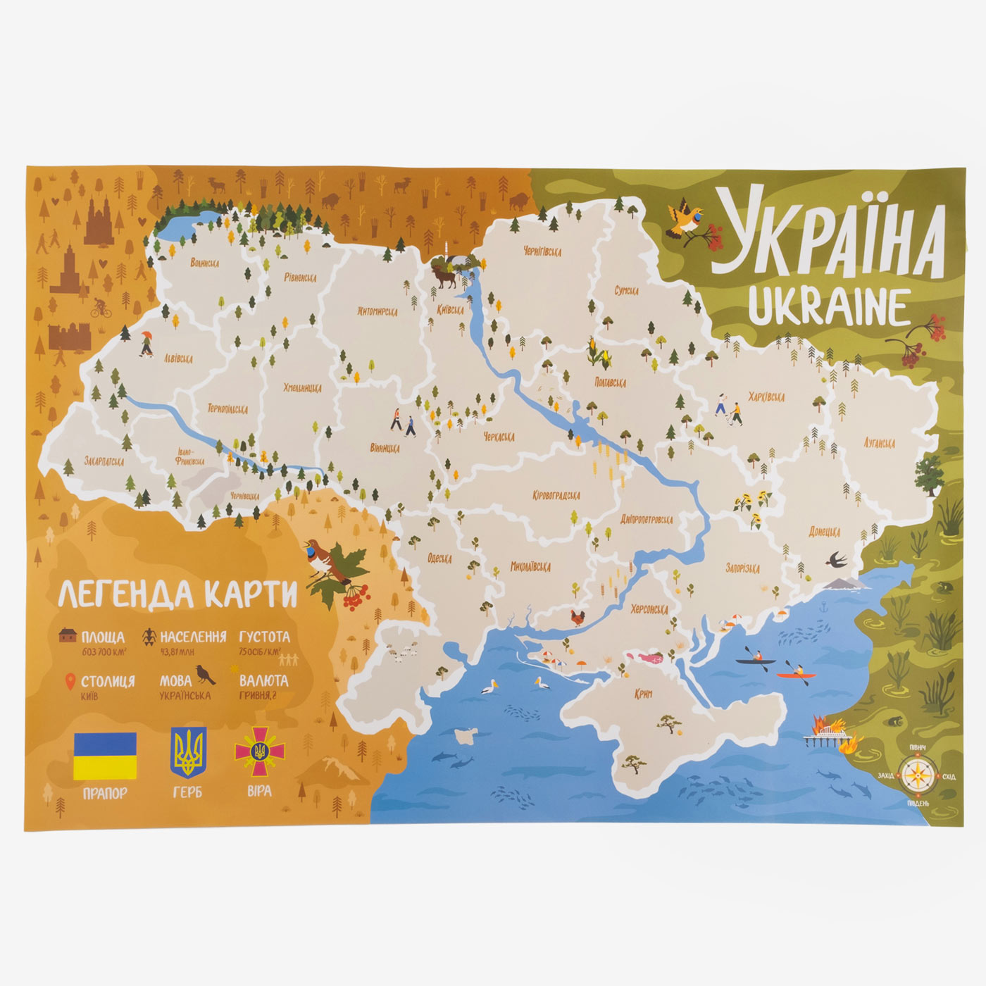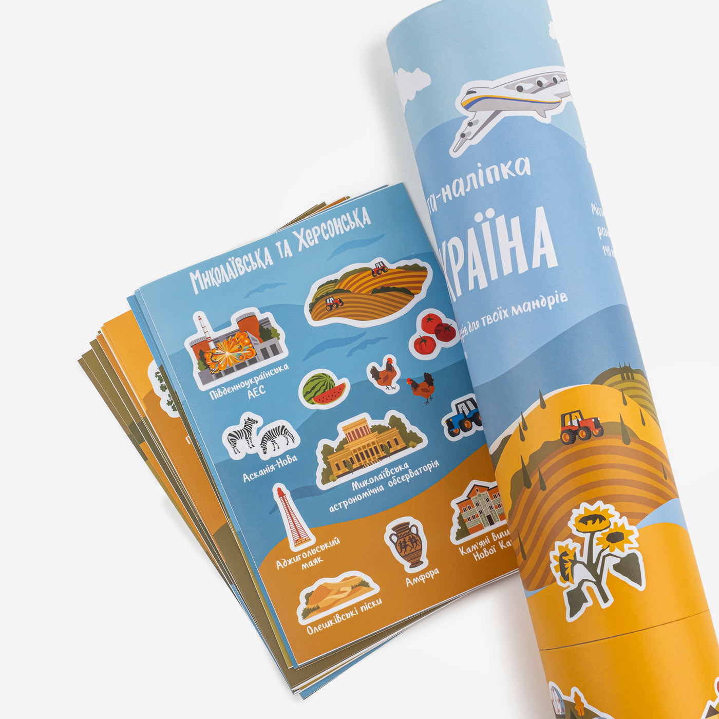 A tube box with a map of Ukraine and 140 illustration stickers. Each one depicts a unique feature of one of the regions – nature, culture or life. Find the right place on the map and stick them all! 100 ₴ from each sticker map will go to the “Come Back Alive” Foundation, a charitable organization committed to providing competent assistance to the military.