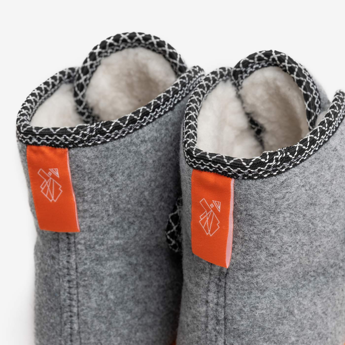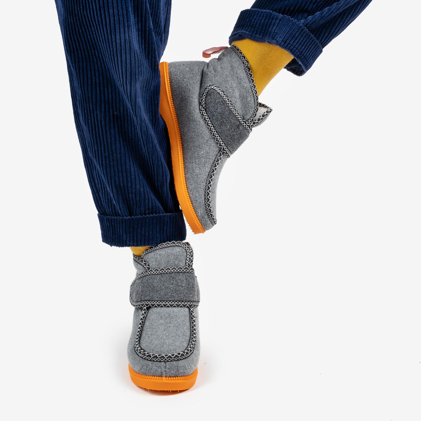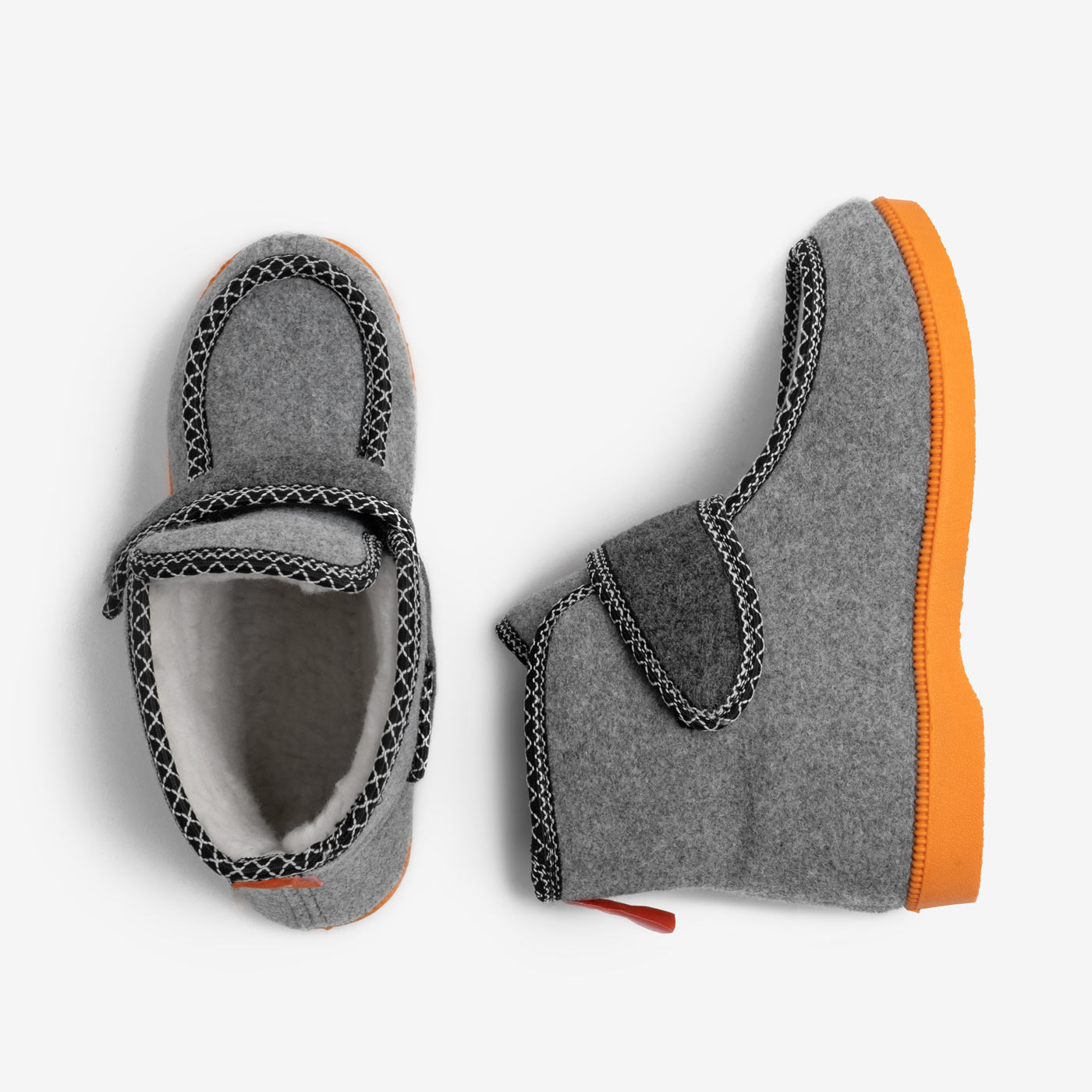 Combining a felt outer with a warm synthetic fur lining, it features a flexible PVC sole.