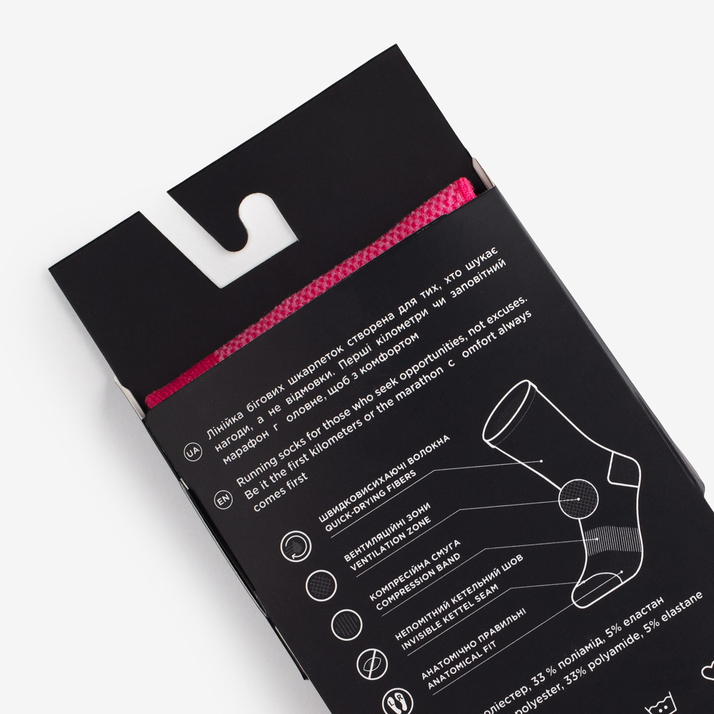 Швидковисихаючі волокна гарно відводять вологу, а вентиляційні зони забезпечують циркуляцію повітря, що дозволяє зберігати ноги свіжими і сухими. Жодних натирань завдяки правильній анатомічній формі шкарпетки та невидимому кетельному шву.