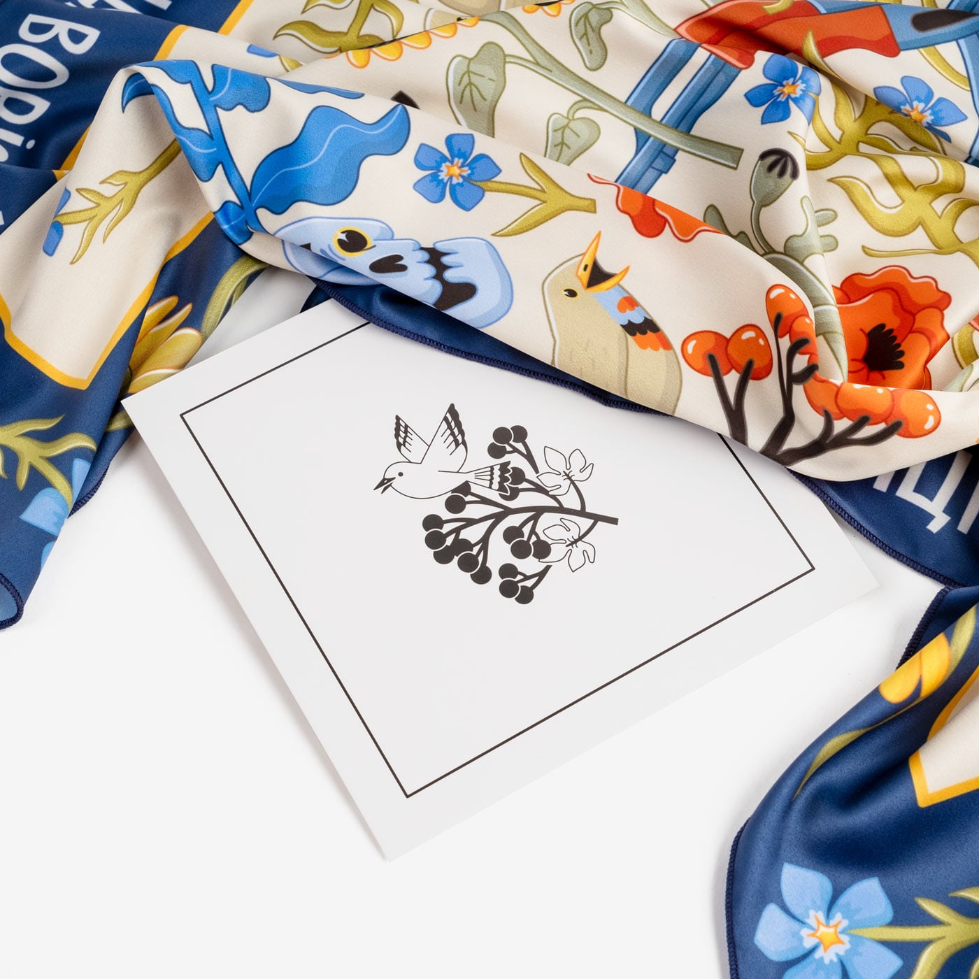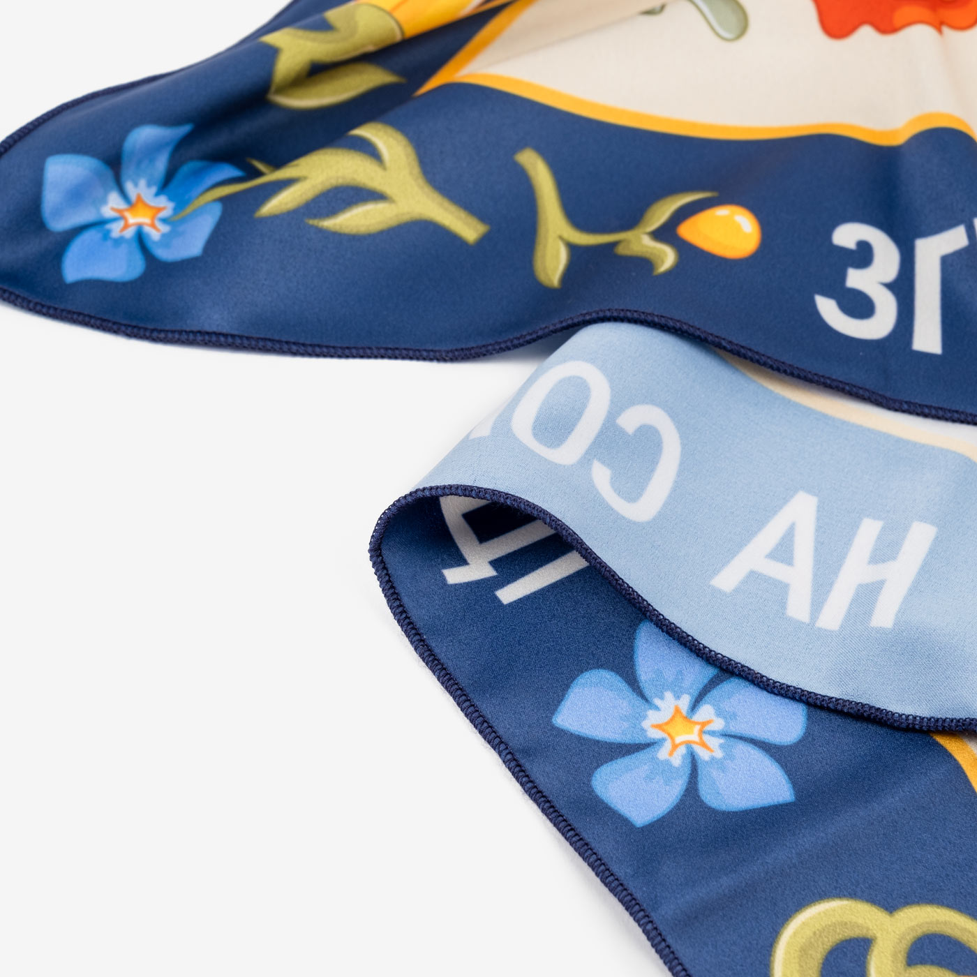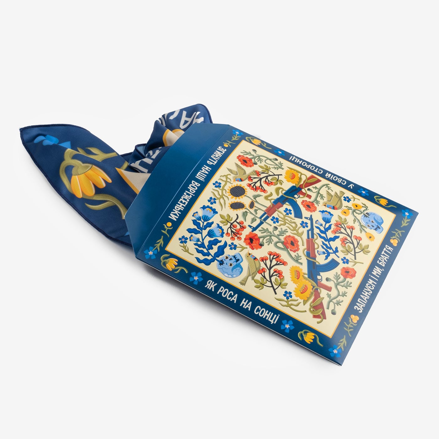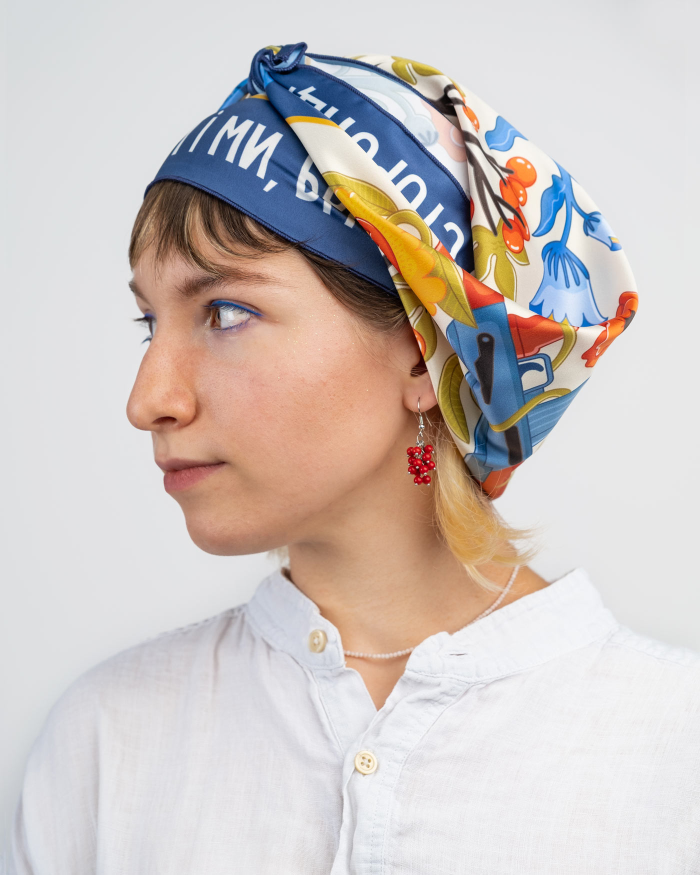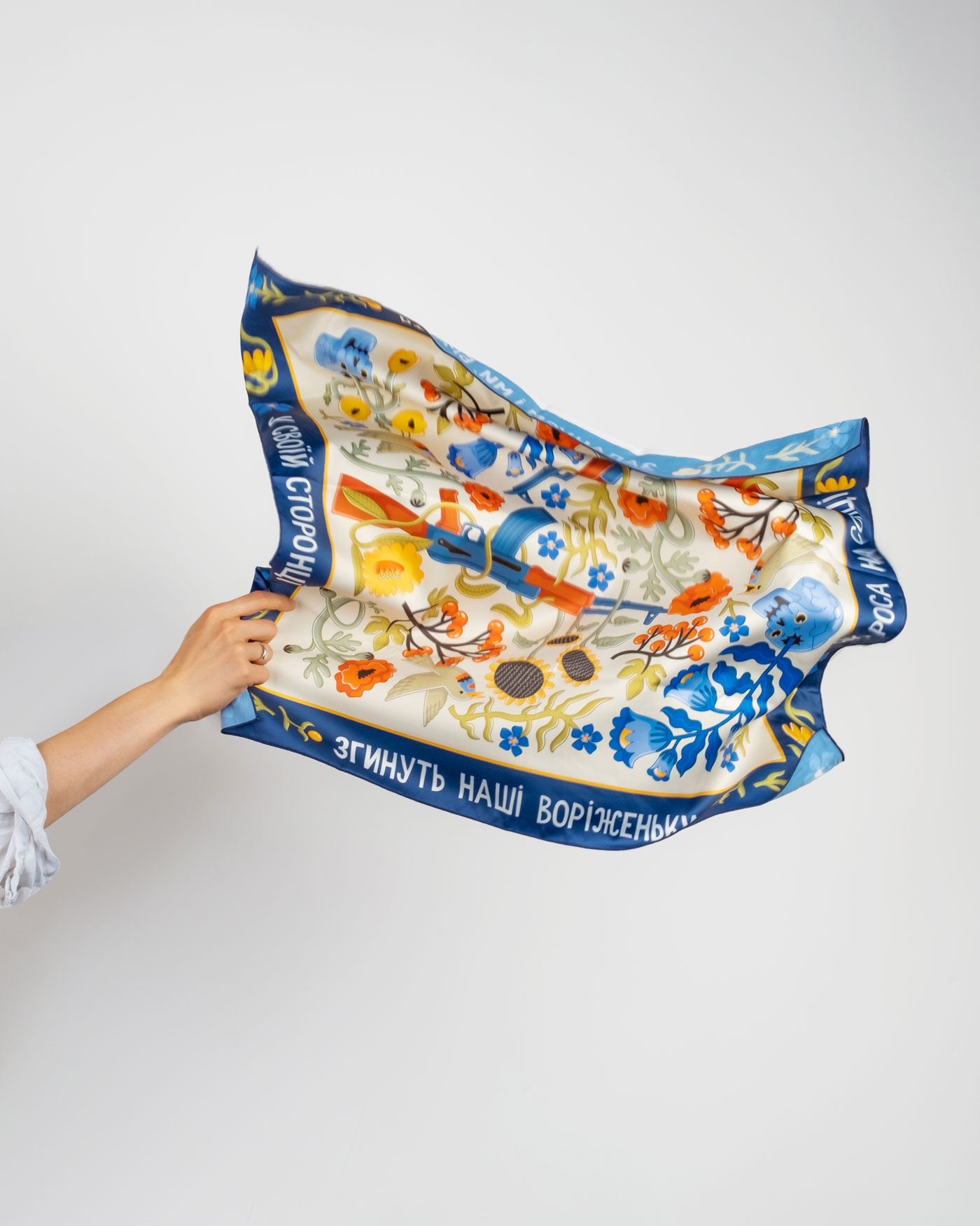 Для створення хустки використаний авторський принт про життєствердність української нації та перемогу життя над смертю. Оздоблений рядками гімну, що стали мантрою для всіх українців та українок.